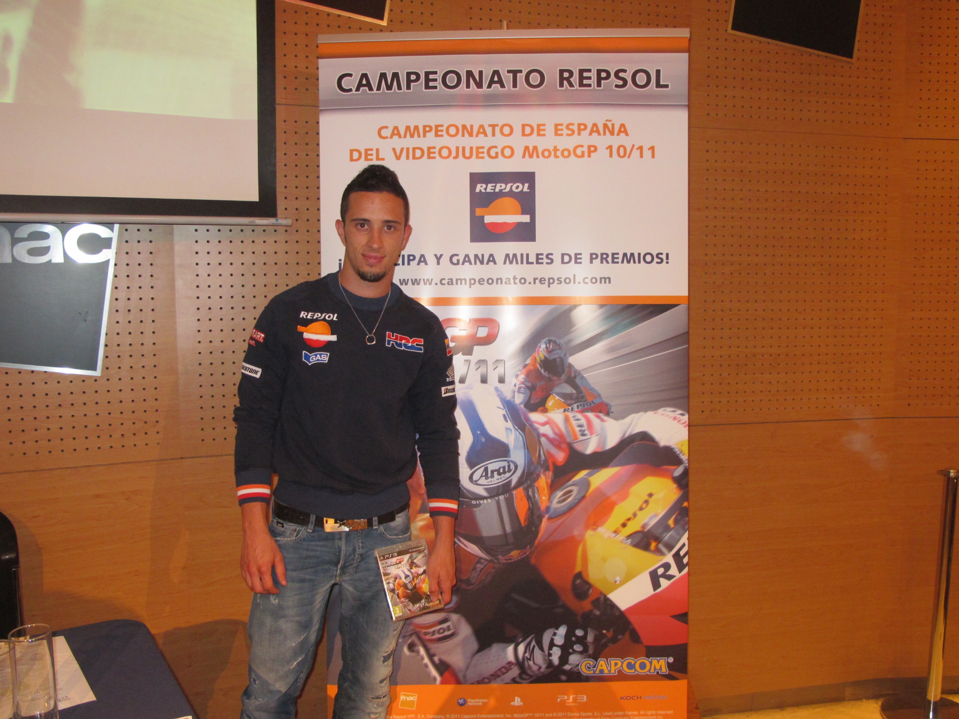 Andrea Dovizioso, piloto del equipo Repsol Honda, ha sido el encargado de presentar en un centro comercial del corazón de Barcelona el Campeonato de España del videojuego MotoGP de la temporada 2010/2011.