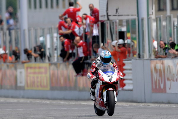Carlos Checa ha dado este fin de semana un nuevo recital en el asfalto del circuito de Misano Adriático, en el que ha conseguido imponerse, de nuevo, en las dos carreras disputadas. En la primera manga, el español del equipo Althea Racing salía desde la segunda posición, justo por detrás de Tom Sykes, pero al poco de iniciar la prueba consiguió superarlo. Checa dominó desde el inicio la prueba pero fue en la segunda mitad de la misma cuando consiguió subir el ritmo, algo con lo que finalmente se separó de Biaggi, que marchaba en segunda posición inquietando al español. Una vez se bajó la bandera a cuadros, Checa cruzó la línea de meta casi con un segundo de ventaja sobre Biaggi, que terminó segundo. En tercera posición llegó Marco Melandri, que no vió peligrar la última plaza del podio ya que la lucha estaba detrás entre Sykes y Laverty, cuarto y quinto respectivamente.