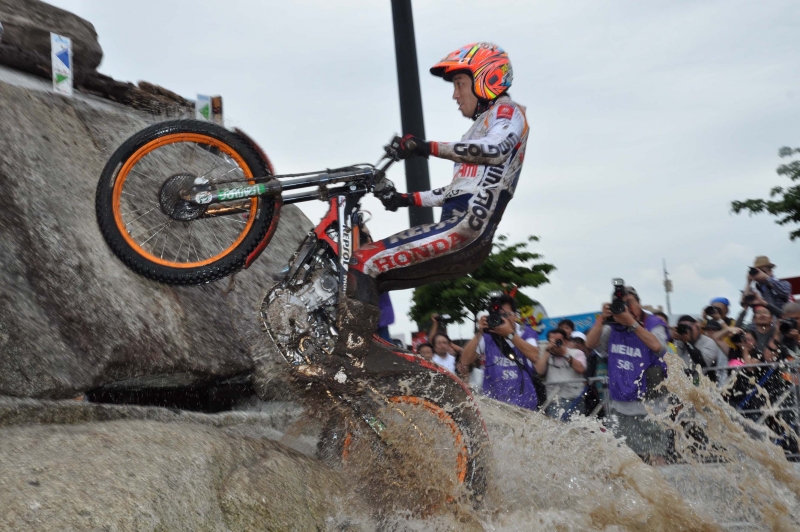El piloto Repsol, Toni Bou, intentó luchar por la victoria desde el inicio del segundo día de competición, pero debido a algunos errores y a la inestabilidad del terreno, no pudo igualar los resultados tanto de su compañero Fujinami, que fue segundo, como los de su rival más directo, Adam Raga, quién se llevó la victoria. El piloto nipón del equipo Repsol Montesa Honda, Takahisa Fujinami, ha intentado aprovechar la oportunidad y ha liderado la prueba hasta la décima zona, en la que ha sufrido una caída y se ha lesionado la rodilla izquierda. Aún así, alentado por competir en casa y de tener de nuevo el podio al alcance, ha cedido sólo dos puntos al vencedor en la primera vuelta y ha acreditado la segunda mejor puntuación en la siguiente.