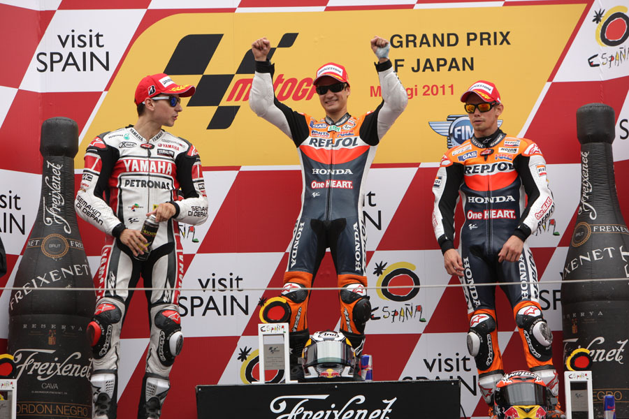 En la categoría reina, Dani Pedrosa volvía a Japón, circuito en el que la temporada pasada sufría una caída que le dejaba sin opciones por el título. Después de que Casey Stoner dominara durante todo el fin de semana, el piloto australiano no ha podido conseguir una victoria por la que ha peleado durante gran parte de la carrera. La prueba ha dado comienzo de una forma muy rara ya que Valentino Rossi ha tenido que abandonar a causa de una caída. Poco después Stoner se pasaba de frenada y perdía el liderato, puesto que ocupaba Pedrosa seguido por Jorge Lorenzo. En este instante el piloto barcelonés ha empezado a tirar muy fuerte, logrando distanciarse del mallorquín de Yamaha y afianzando su liderato vuelta a vuelta. Por detrás los problemas se iban sucediendo. Dovizioso, Simoncelli y Crutchlow se veían obligados a hacer un paso por el pit lane por adelantarse en la salida. Las caídas han hecho estragos. Los pilotos españoles Bautista, Barberá y Elías se han ido al suelo cuando se encontraban en unas buenas posiciones de carrera. Barberá ha tenido que ser evacuado en camilla a causa del accidente pero parece que no sufre nada gave más allá de una fractura en la clavícula derecha. Finalmente Pedrosa, Lorenzo y Stoner ha sido quienes han subido al podio.